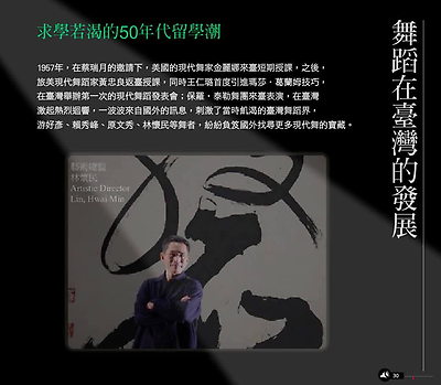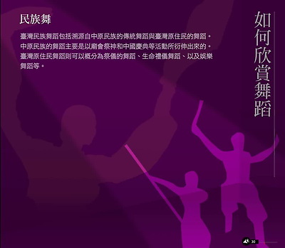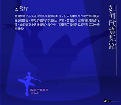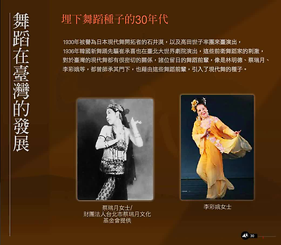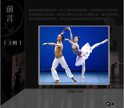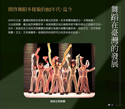 台灣藝術文化發展史中,不論是舞蹈、戲劇、音樂或建築,都具有濃厚的文化色彩,同時接受西方文化藝術多元融合之後,展開台灣舞蹈發展史新頁。