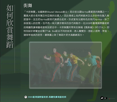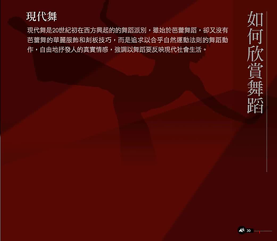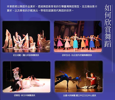本課程邀請到知名舞評家陳雅萍女士,介紹民俗舞蹈、芭蕾舞、現代舞和街舞在台灣的發展,並藉由賞析重要舞作的經典片段,引導大眾進而欣賞台灣代表舞團的精采作品。